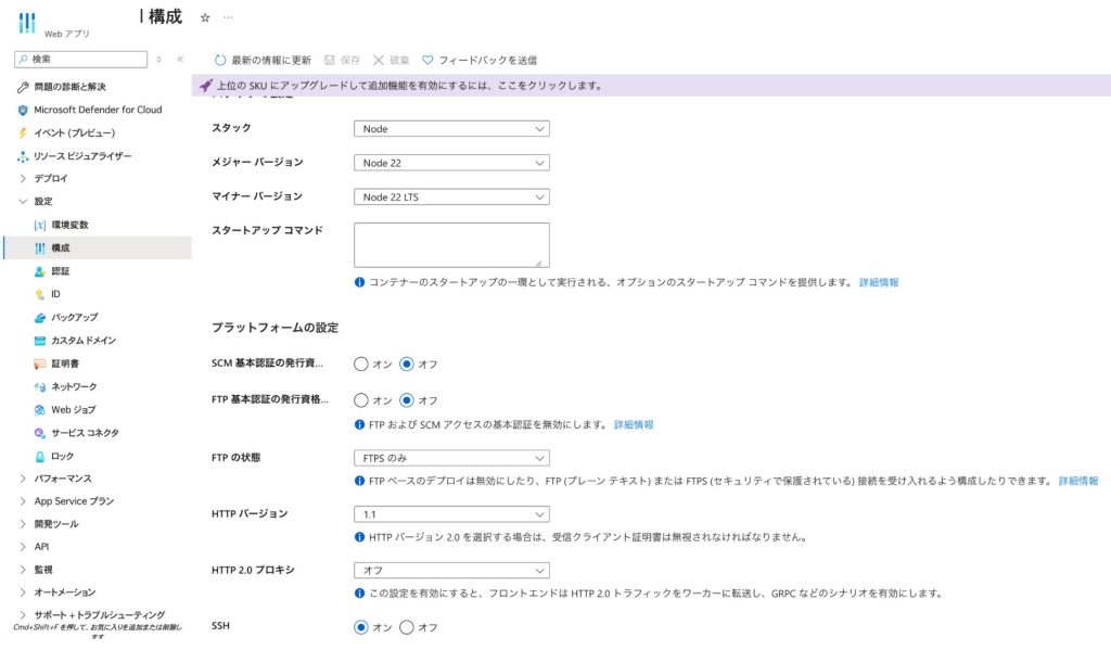 - App Service管理ブレードの「設定」セクションから「構成」を選択