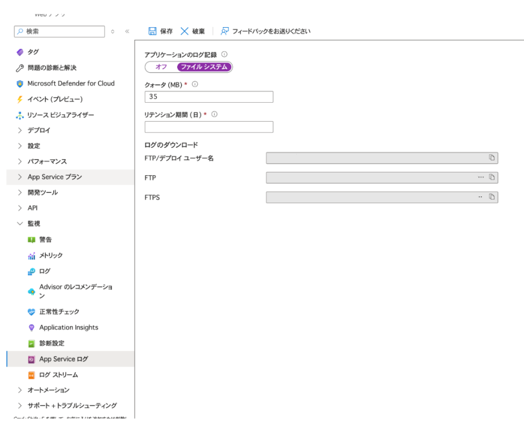 - App Serviceの左側メニューから「監視」セクションの「App Service ログ」を選択します