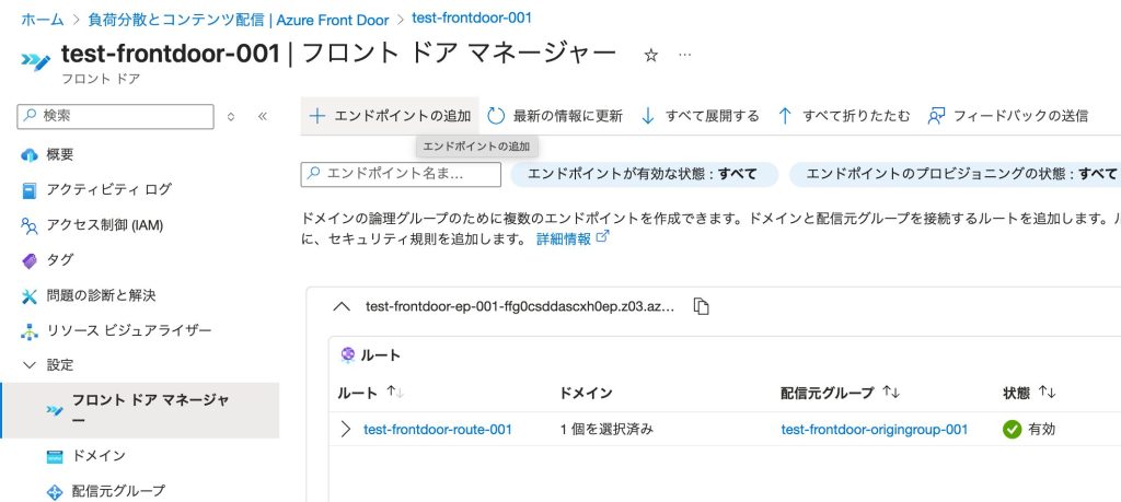 - 対象のFront Doorプロファイルを選択し、設定 > フロント ドア マネージャー で「+ エンドポイントの追加」をクリックします