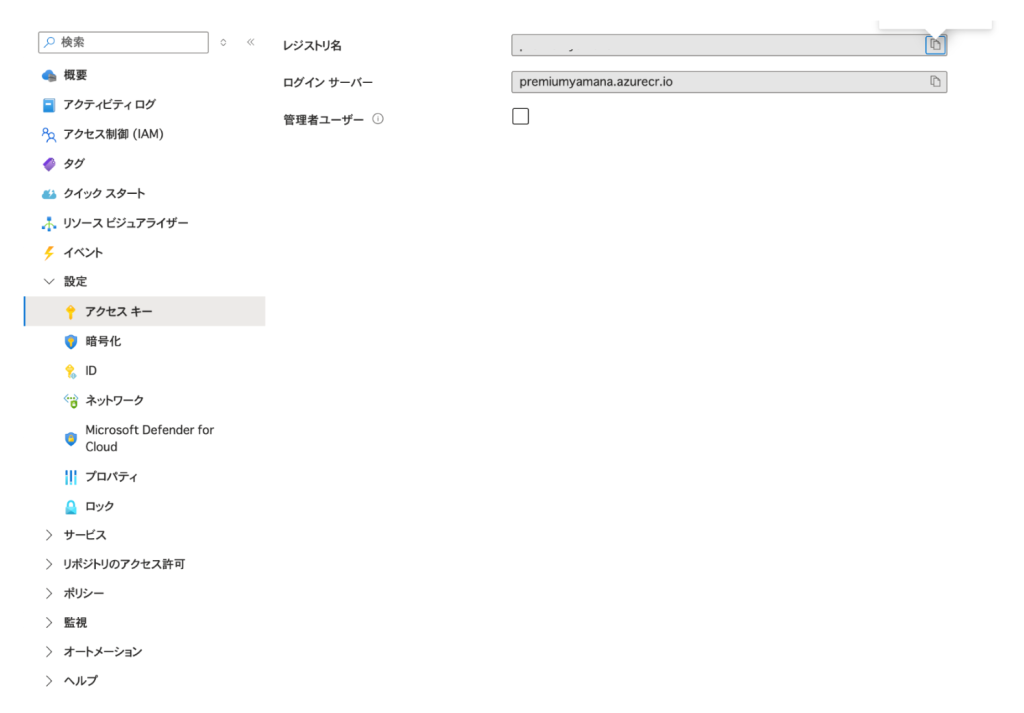 Azure コンソールを使用して、Container Registryの管理者アカウントを無効化します。
