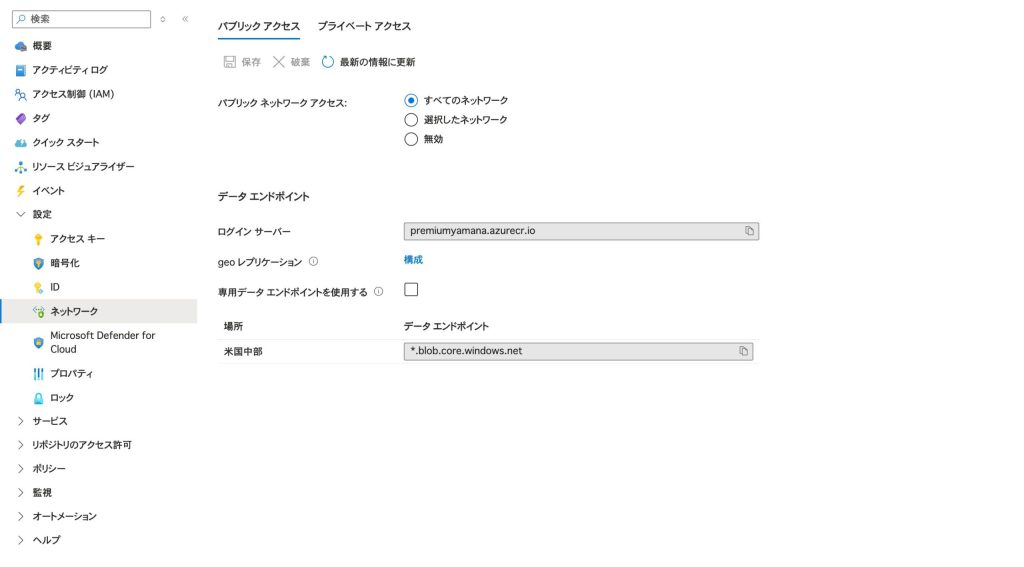 Azure コンソールを使用して、Container Registryのパブリックアクセスを無効化します。