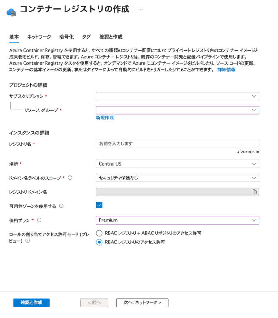 - リソース グループ:Container Registry と同じリソース グループを選択