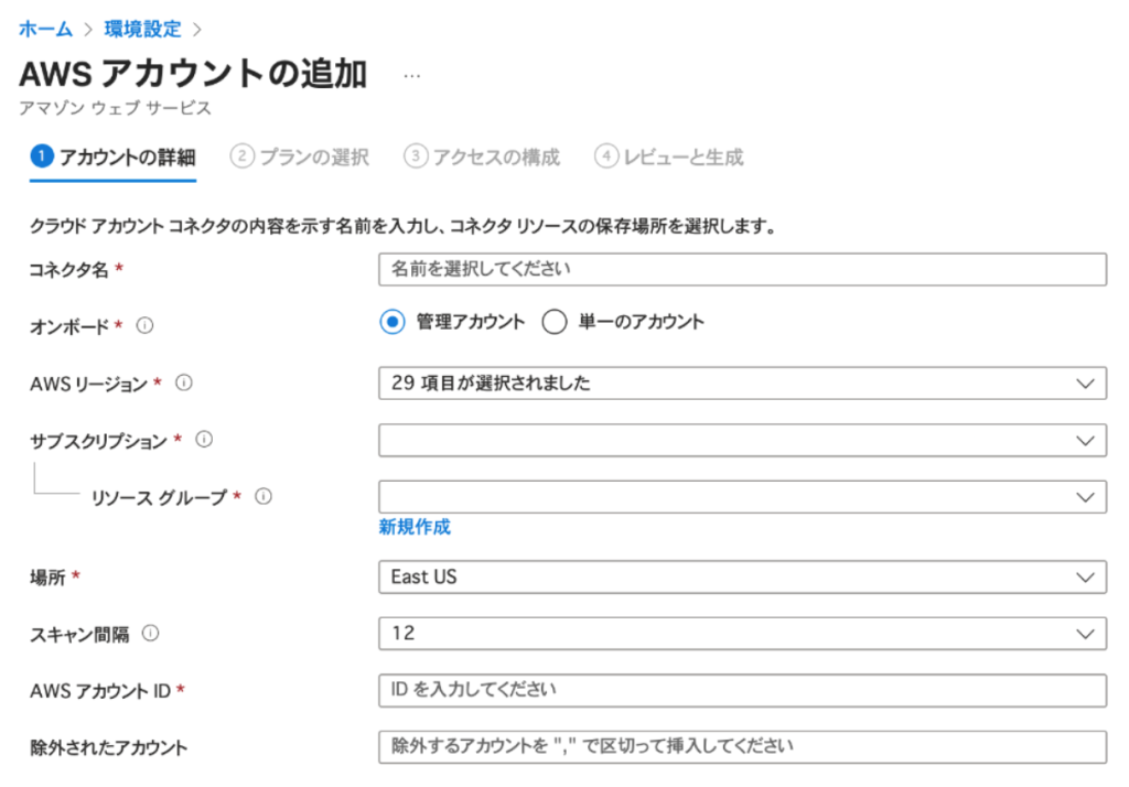 - IAMロールARN:arn:aws:iam::123456789012:role/AzureDefenderForCloud