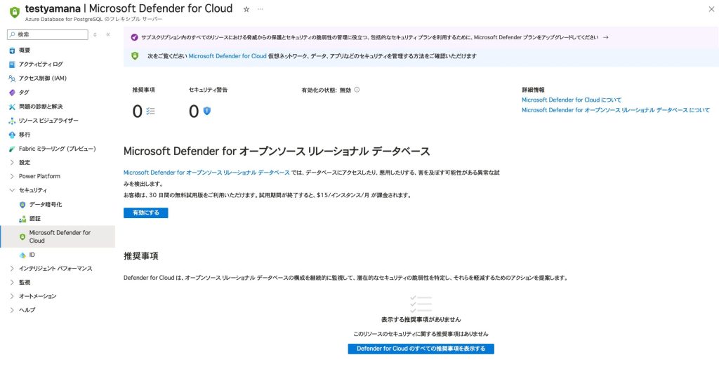 - 「Microsoft Defender for Open-Source Relational Databases を有効にする」をクリック