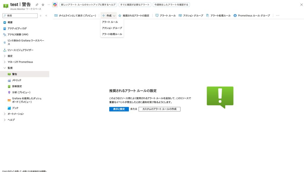- Azure Monitor > 「アラート」 > 「+ 新しいアラートルール」