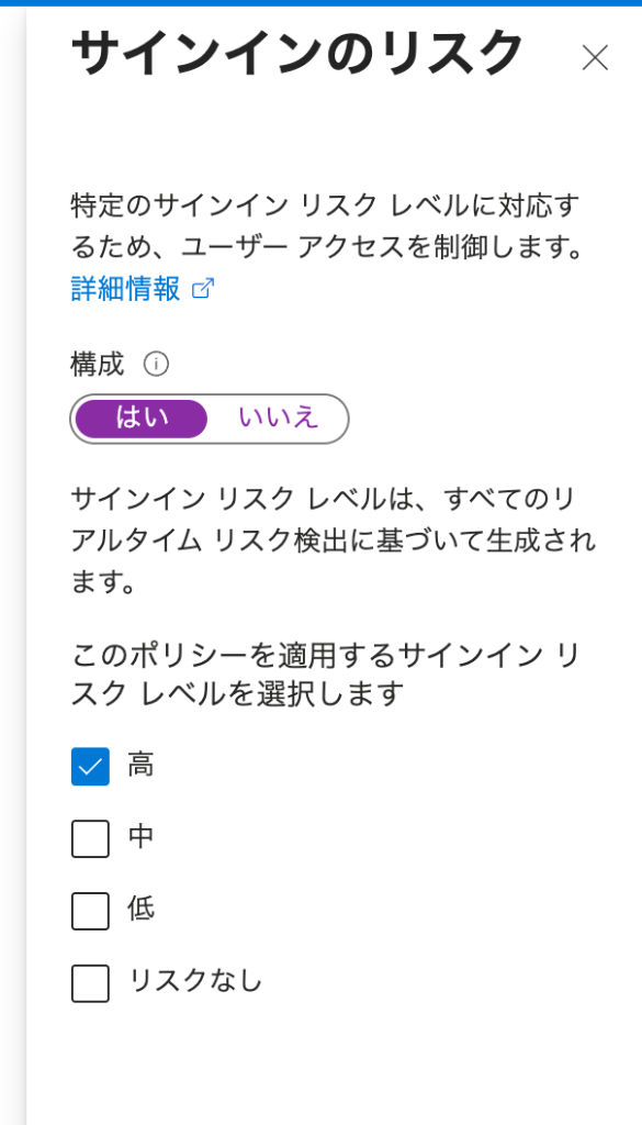 - サインインリスク → リスクレベル「高」を選択