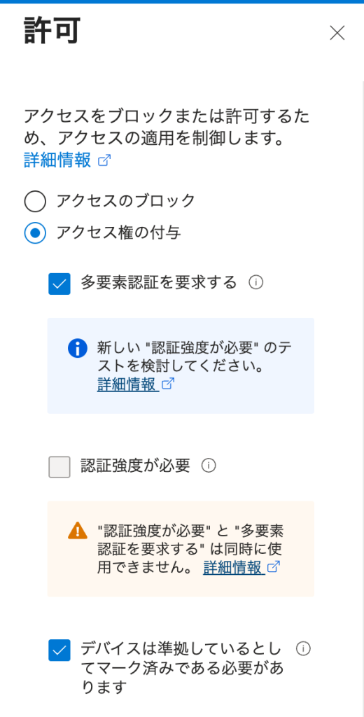 - 許可 → 「アクセス権の付与」→「多要素認証を要求する」