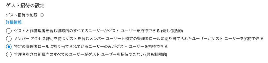 - ✅「特定の管理者ロールに割り当てられているユーザーのみがゲスト ユーザーを招待できる」(推奨)