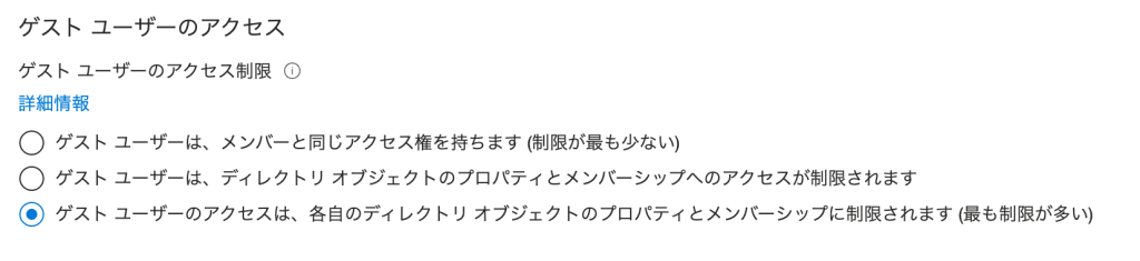 - 「ゲスト ユーザーのアクセスは、ディレクトリ オブジェクトのプロパティとメンバーシップに制限されます(最も制限的)」を選択