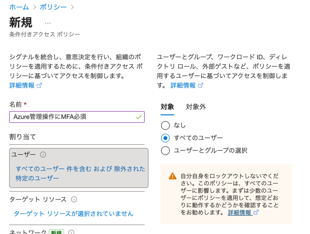 - ポリシー名を入力します(例:「Azure管理操作にMFA必須」)