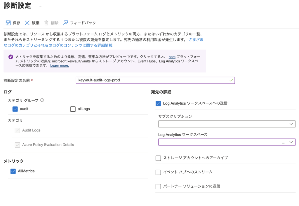 ログカテゴリ: ☑ AuditEvent(必須) - Vault操作:アクセスポリシーの変更、ファイアウォール設定 - Key操作:作成、削除、バックアップ、復元、暗号化/復号化 - Secret操作:取得、設定、削除、一覧表示 - Certificate操作:作成、インポート、更新、削除 メトリック: ☑ AllMetrics - ServiceApiHit:API呼び出し数 - ServiceApiLatency:応答時間 - ServiceApiResult:成功/失敗率 - SaturationShoebox:容量使用率 - 宛先の構成(複数選択推奨)