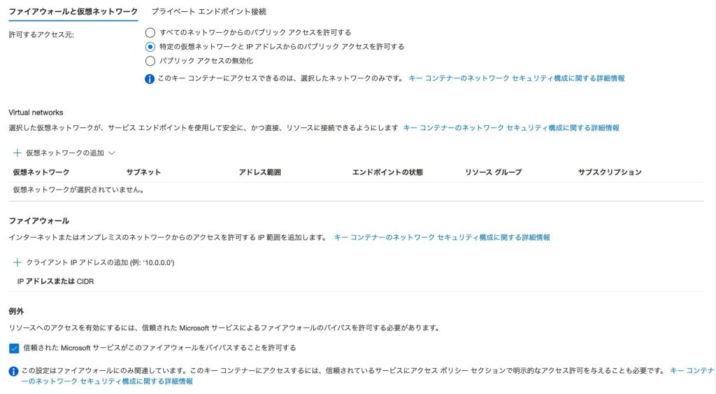 - 仮想ネットワーク: Key Vaultにアクセスする仮想ネットワークを選択