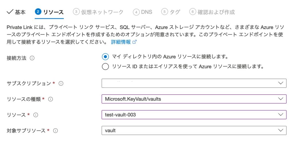 - リソースグループ: プライベートエンドポイント用のリソースグループを選択(Key Vaultと同じRGを推奨)