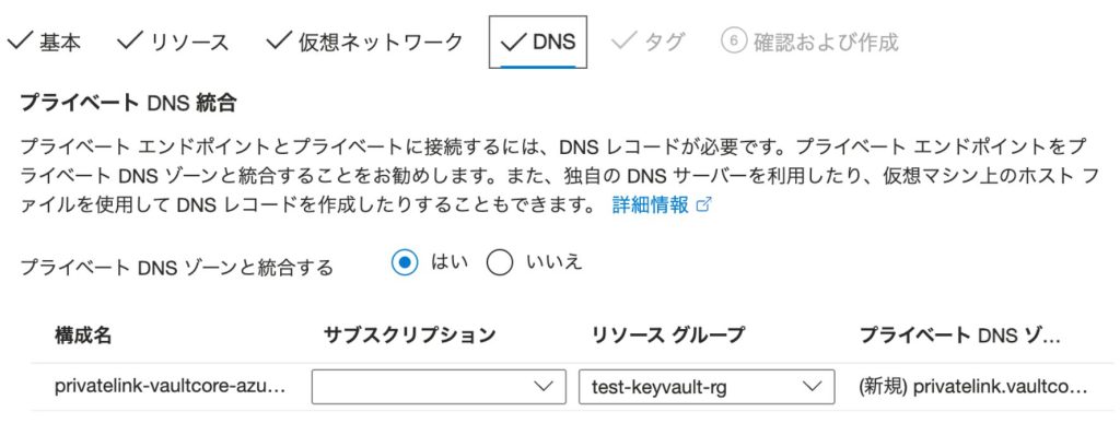 - 「プライベートDNSゾーンと統合する」: 「はい」を選択(強く推奨)