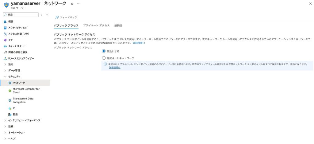 Azure Portalを使用して、SQL Serverのパブリックネットワークアクセスを無効化します。