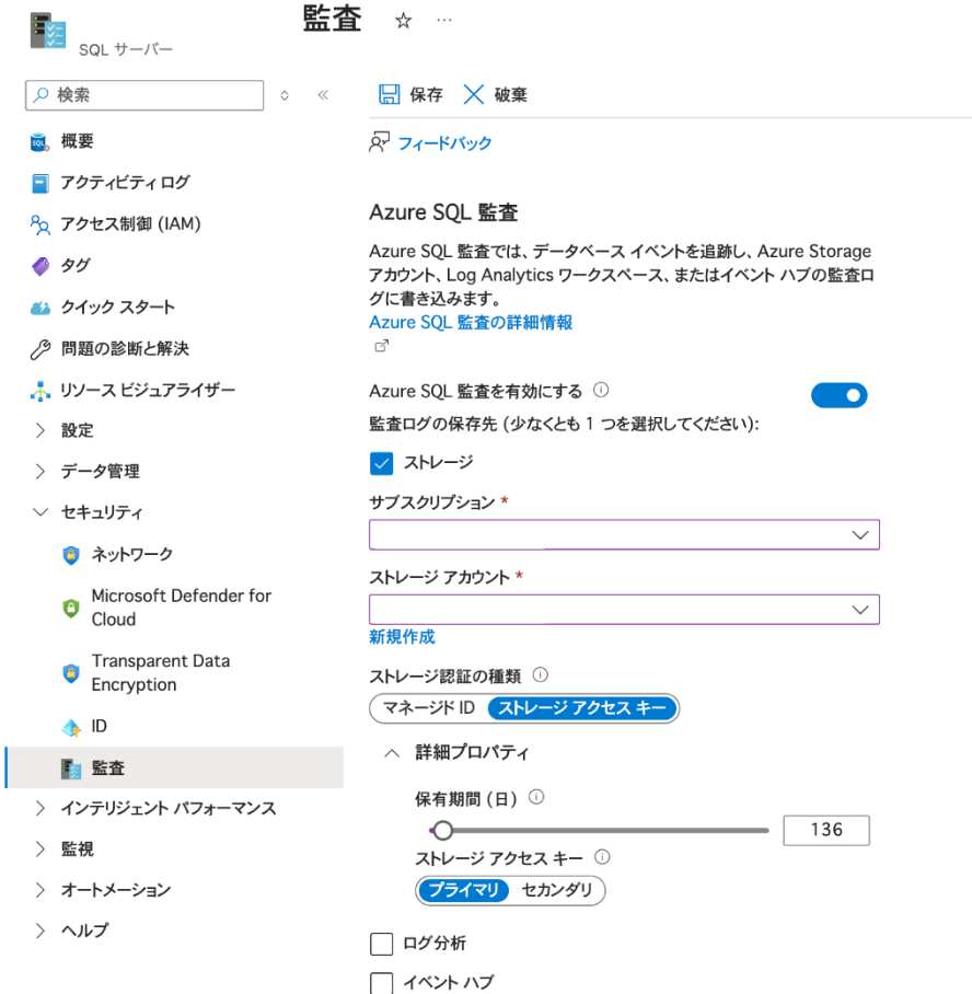 Azure ポータルを使用して、SQL Server監査を有効化します。