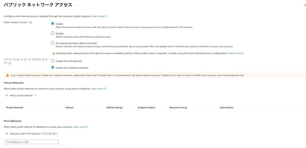 - 仮想ネットワークの追加(「選択した仮想ネットワークとIPアドレスから有効」を選択した場合)