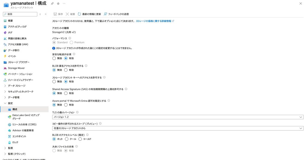 Azure コンソールを使用して、ストレージアカウントでTLS 1.2以上を必須とする設定を行います。