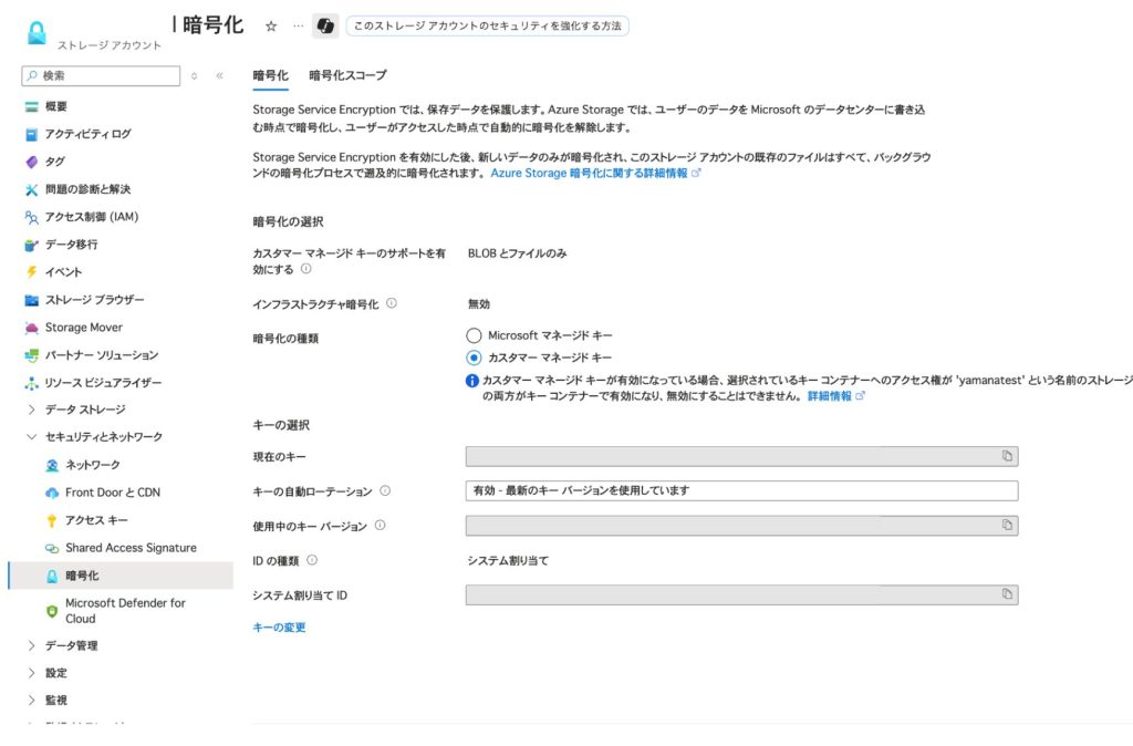 - ストレージアカウントの「セキュリティとネットワーク」→「暗号化」に移動