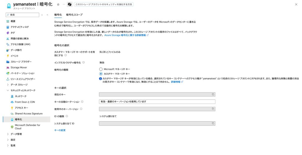 - 対象ストレージアカウントの「セキュリティとネットワーク」→「暗号化」