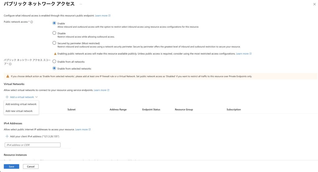 - 選択したネットワークからのみ許可:特定のVNet/IPからのみアクセス可能(推奨)