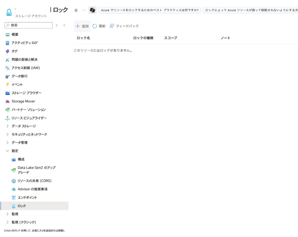 - ストレージアカウントの詳細ページで、左側のメニューから「設定」セクションの「ロック」を選択