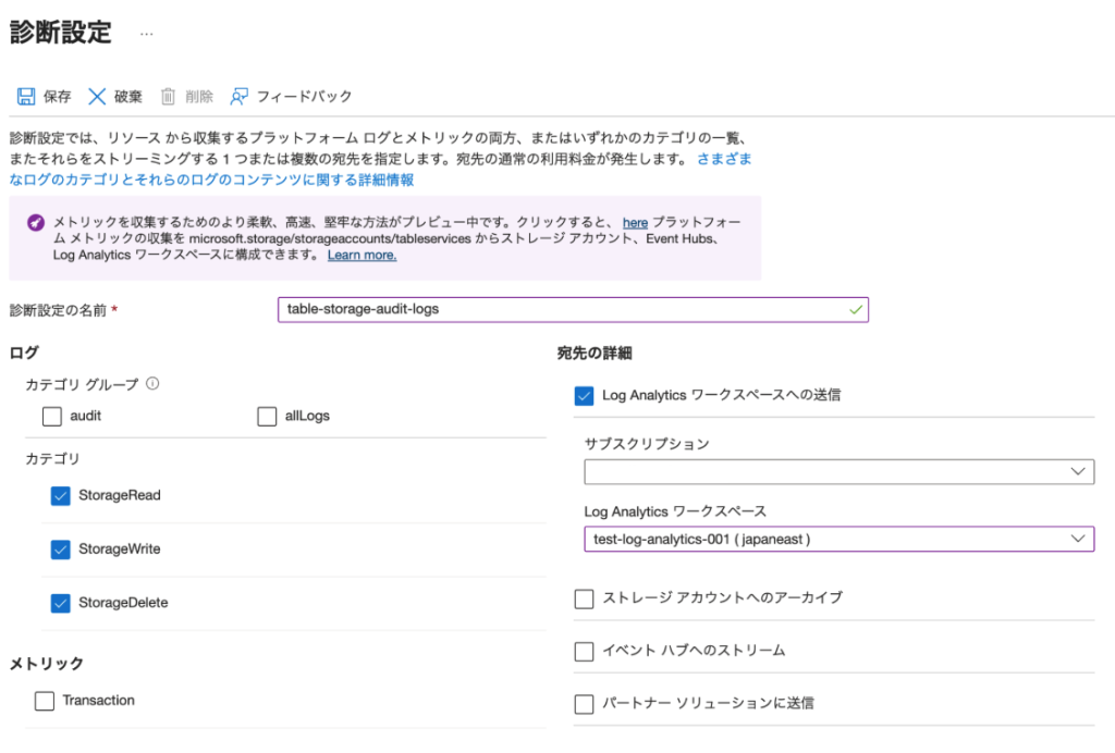 - 診断設定の名前を入力(例:table-storage-audit-logs)