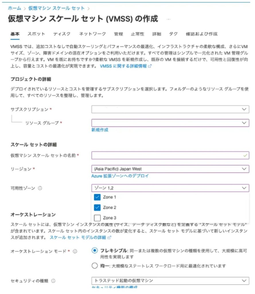 Azure コンソールを使用して、VMスケールセットのゾーン冗長を有効にします。