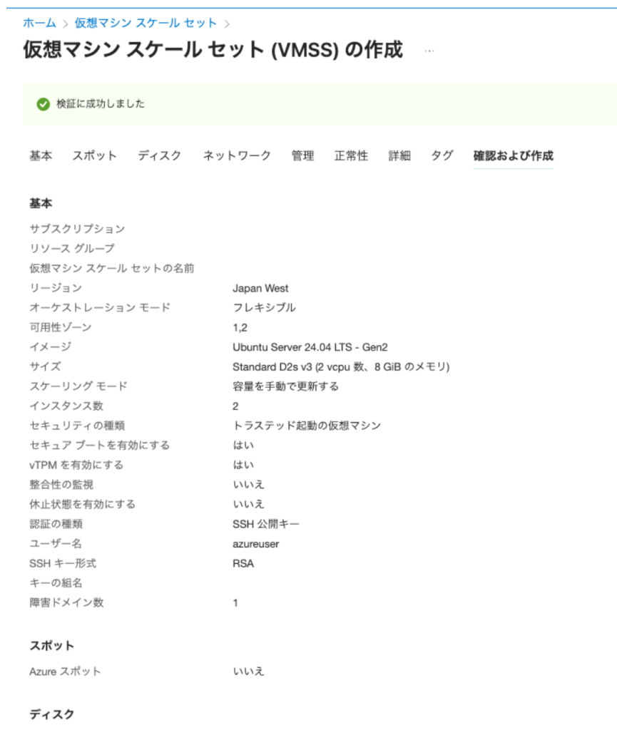 - 「確認および作成」をクリックして、設定を確認後、作成します