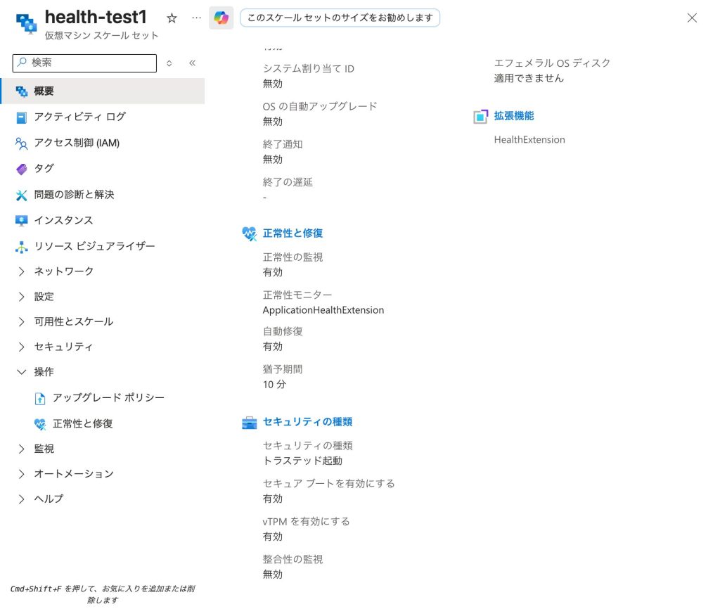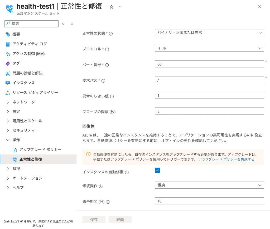 Azure コンソールを使用して、VMスケールセットの自動修復を有効化します。